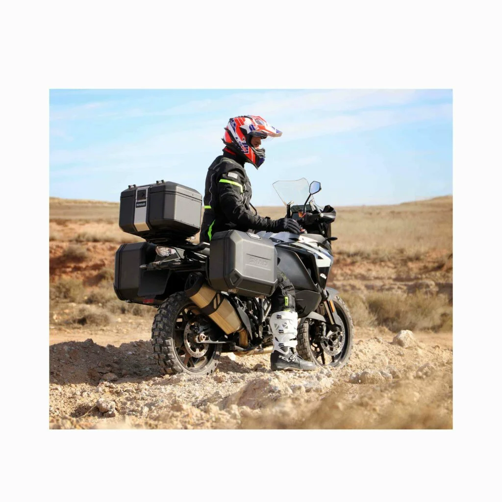 La maleta lateral TR36LB está diseñada, desarrollada y fabricada 100% en Barcelona. Fabricada en aleación de aluminio endurecido, un tipo de aluminio más fuerte y ligero que permite una sección transversal reducida de 1,2 mm para obtener un peso mínimo con la máxima resistencia. La TR36 izquierda Black Edition está acabada con pintura negra en polvo resistente a los arañazos. Incluye el sistema patentado TERRA Lock System.
